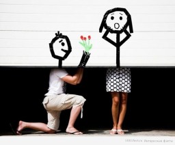 Многие парни просят чужих людей сфотографироваться со словами из стихов или теста, составляющих предложение выйти замуж. Потом создается банер либо большой плакат, объединяющий слова в единое признание в любви.